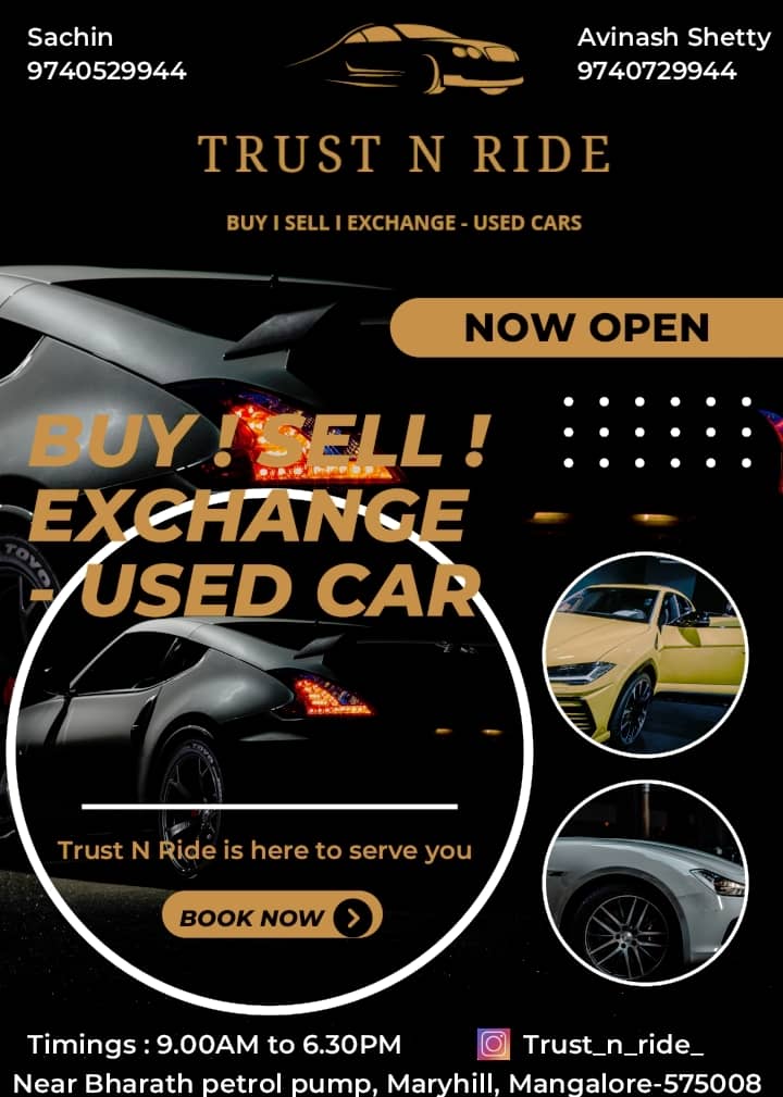 5 (1) TRUST N RIDE : Near Bharath Petrol Pump, Mary Hill, Mangalore : trustride9944@gmail.com : : 9740529944, 9740729944 USED CAR DEALERS, BUY, SELL, EXCHANGE. TIMINGS : 9.00AM TO 6.30PM, SUNDAY HOLIDAY Did you find this Ad helpful? Click on a star t...
