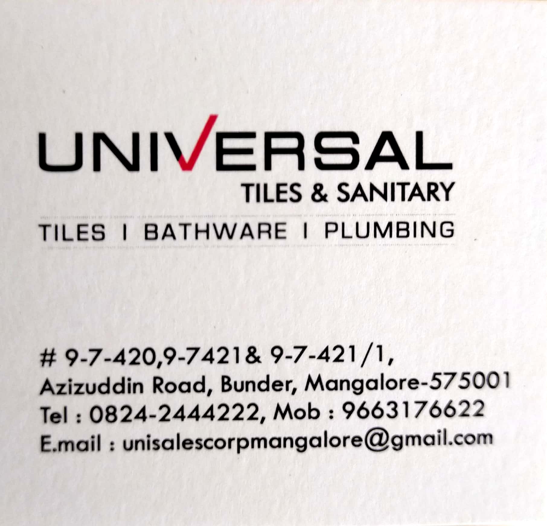2 (1) UNIVERSAL TILES & SANITARY : 9-7-420, 9-7-421, 9-7-421/1, Aziziddin Road, Bunder, Mangalore 575001 :unisalescorpmangalore@gmail.com : : 0824 2444222, 9663176622, 9986281361, 9741993367, 7795422222 TILES & SANITARY WARE, BATH WARE & ...