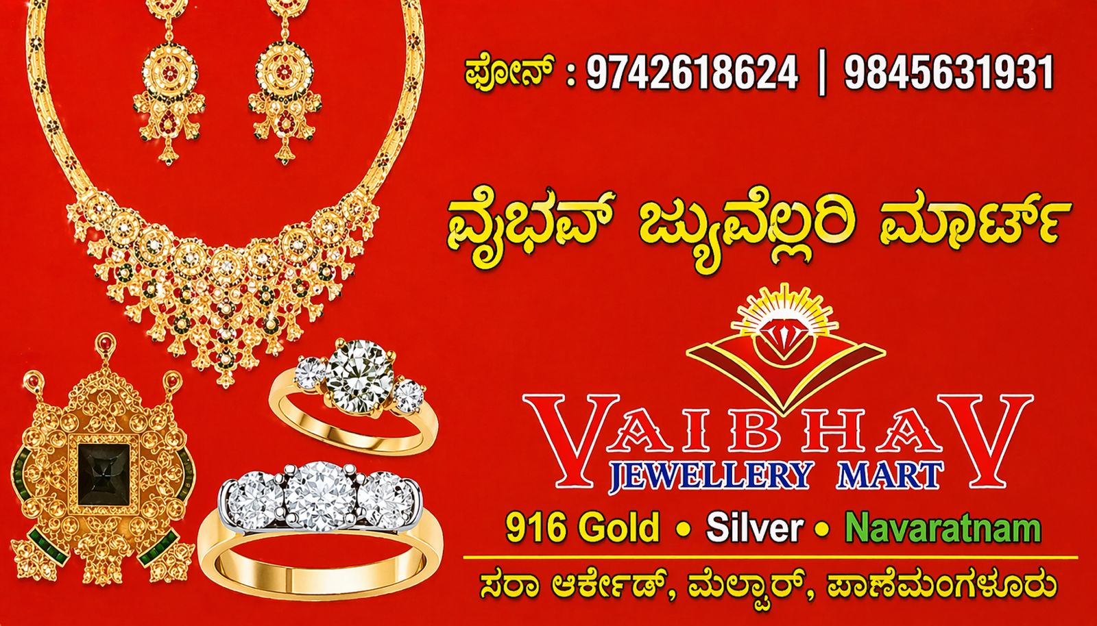 0 (0) VAIBHAV JEWELLERY MART : 1st Floor, Sara Arcade, Melkar, Panemangalore : : : 9742618624, 9845631931 JEWELLERY SHOP TIMINGS : 9.00AM TO 7.30PM, SUNDAY : 9.00AM TO 1.00PM. Did you find this Ad helpful? Click on a star to rate it! Submit Rating T...